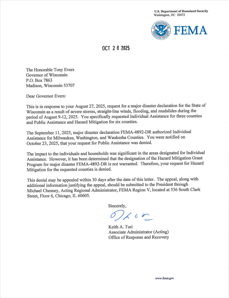 The denial letter addressed to Gov. Tony Evers from FEMA’s Office of Response and Recovery.