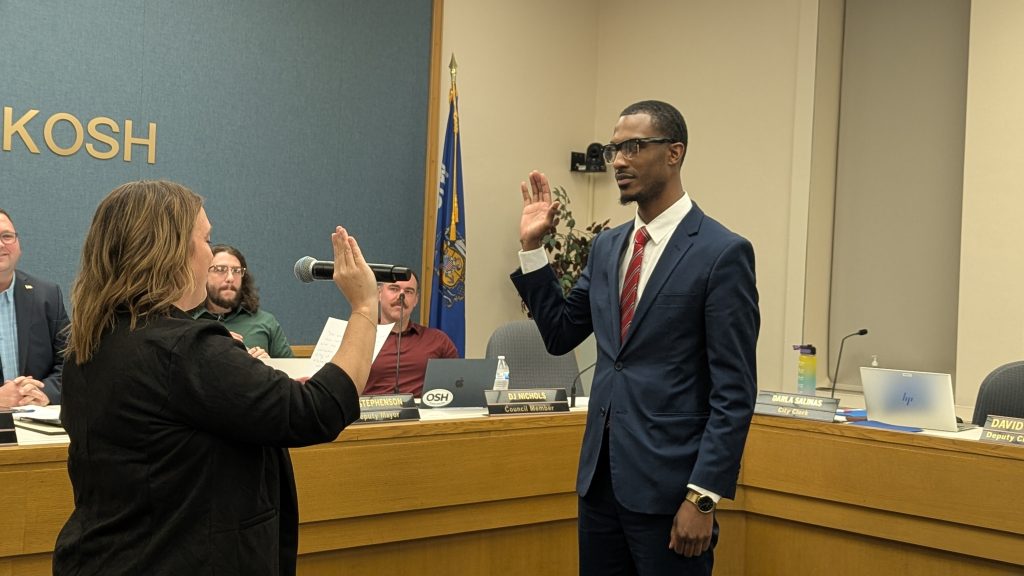 OSHKOSH, WI—(WISS)— On Tuesday night, the Oshkosh Common Council heard presentations from 13 of the 14 candidates interested in filling the seat left vacant when Kris Larson resigned from the Common Council in October. Following the presentations, the council appointed Jacob Amos, who was sworn in immediately.