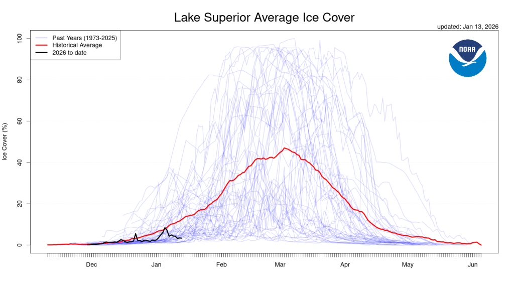 At a time when the lakes should be thickening their ice up, they are doing the opposite and thinning. Great Lakes ice coverage is well below average, dropping from nearly 15% coverage down to 5% in one week.